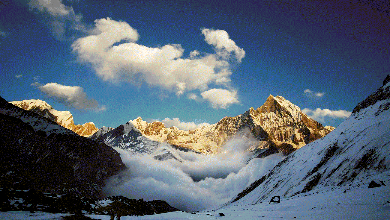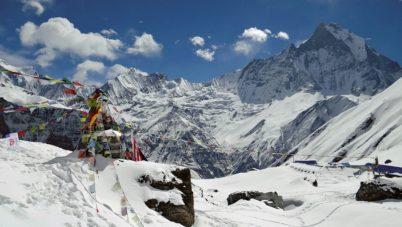 amphitheater of peaks including Annapurna I, Machhapuchhre, Hiunchuli, and others. The